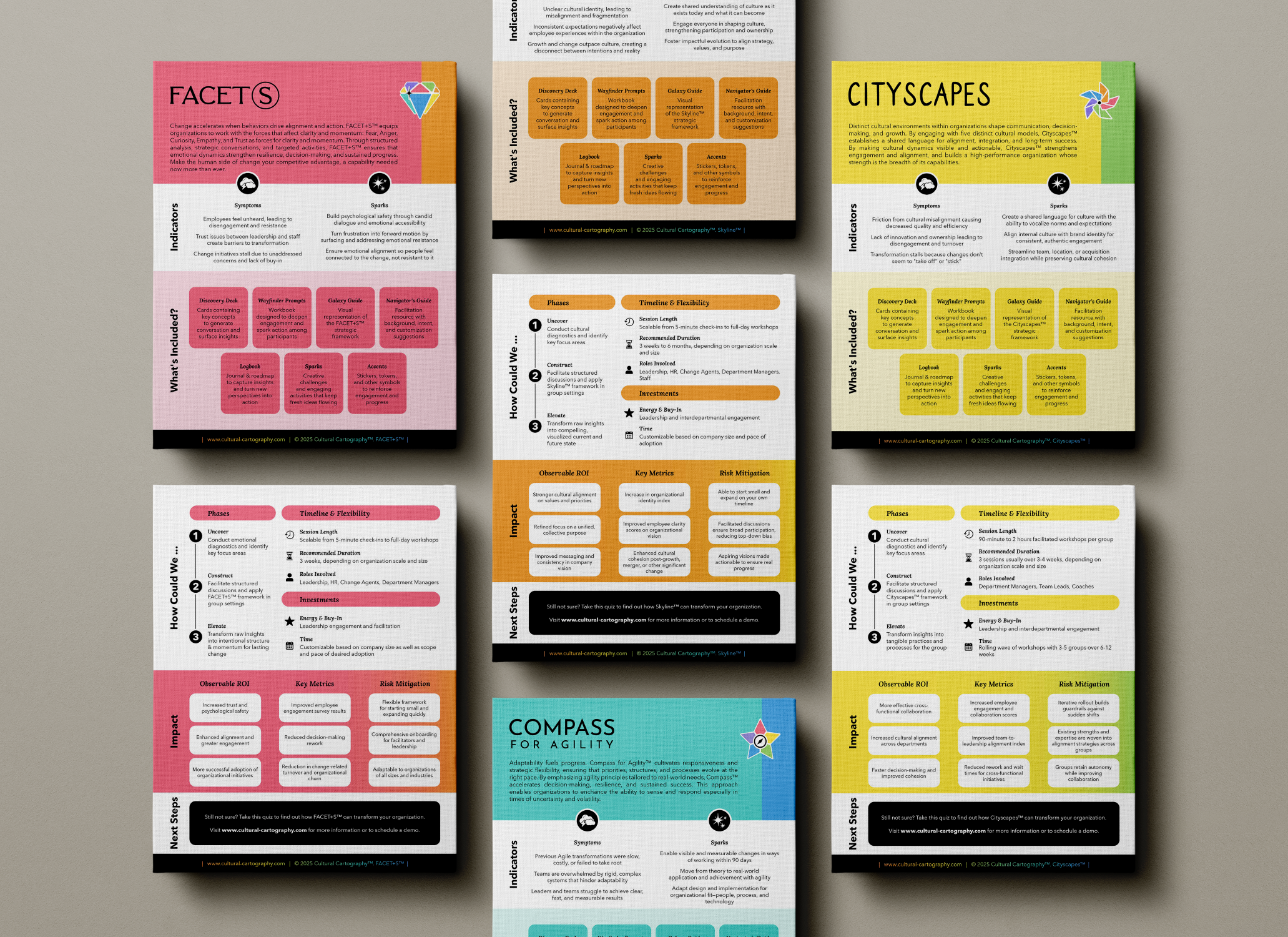Cultural Cartography™ is an innovative, modular framework of techniques, publications, and workshops that help organizations make sense of cultural change. The goal was to take big, often abstract ideas and turn them into something leaders and teams could actually use in real situations. I wanted the design to feel confident but approachable — something that could work in a variety of organizational settings while still feeling cohesive.